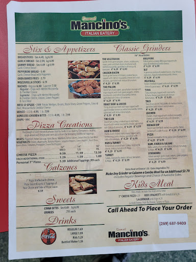 For those who enjoy a good grinder, Mancino's offers a variety of delicious choices. From the Chicken Bacon Club to the savory Chicken Parmesan, you’re sure to find a satisfying bite. And don't forget to check out their Kids Menu, which has plenty of kid-friendly options like the Toasted Cheese Grinder and Kids Cheese Pizza.